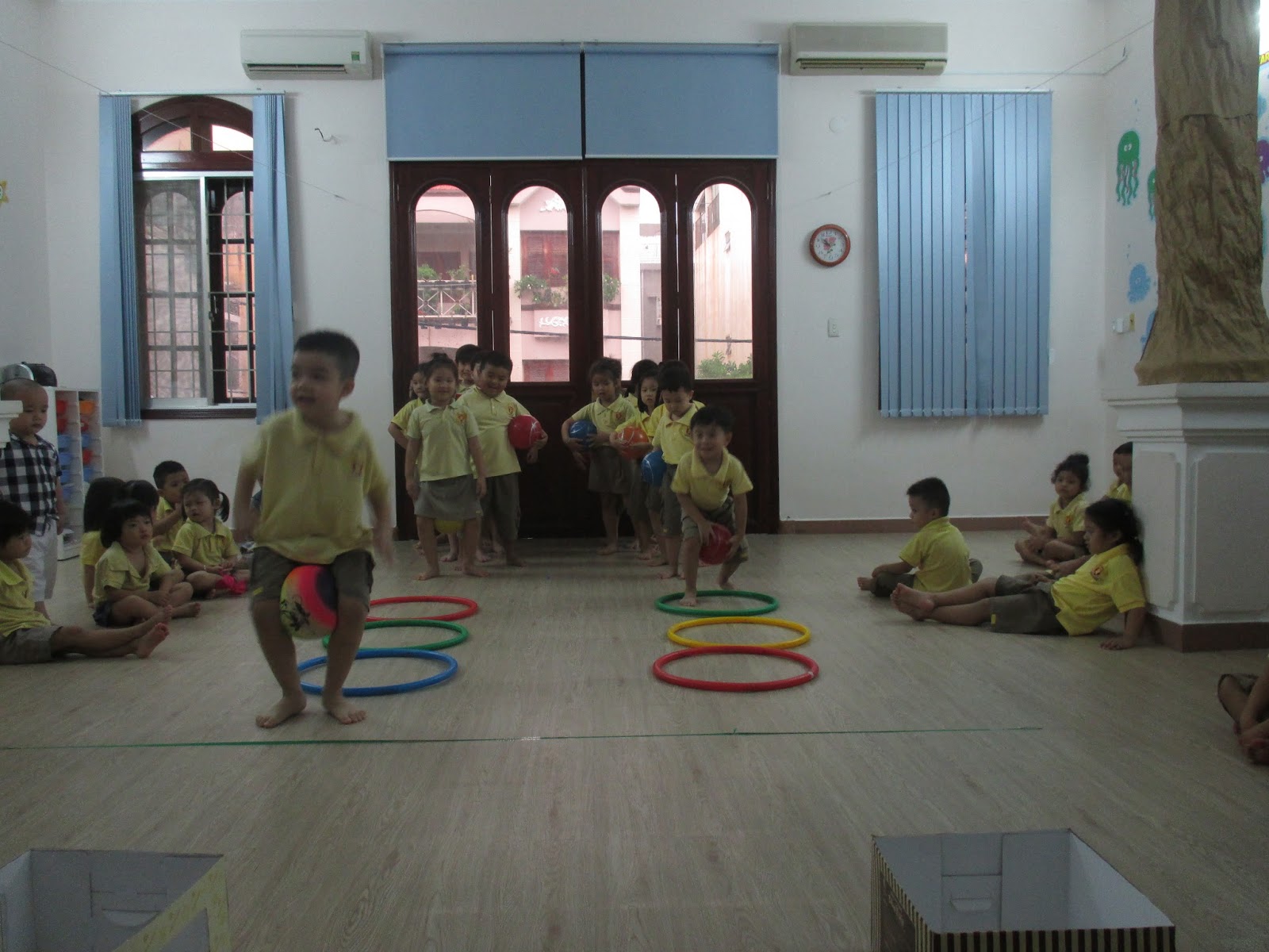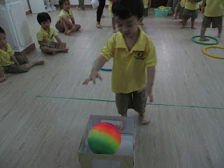Các em nhỏ sẽ cầm bóng và nhảy vào vòng rồi ném bóng vào hộp còn các anh chị (K1&K2) sẽ phải kẹp bóng vào chân và nhảy nhé.